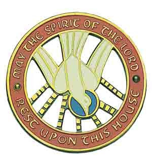 This petite beautiful and colorful wall plaque is designed in a round shape with descending dove and reads 'May the Spirit of the Lord Rest Upon This House' house blessing wall decor measures 2.5' in diameter. Enameled colors, nails included, gift boxed.