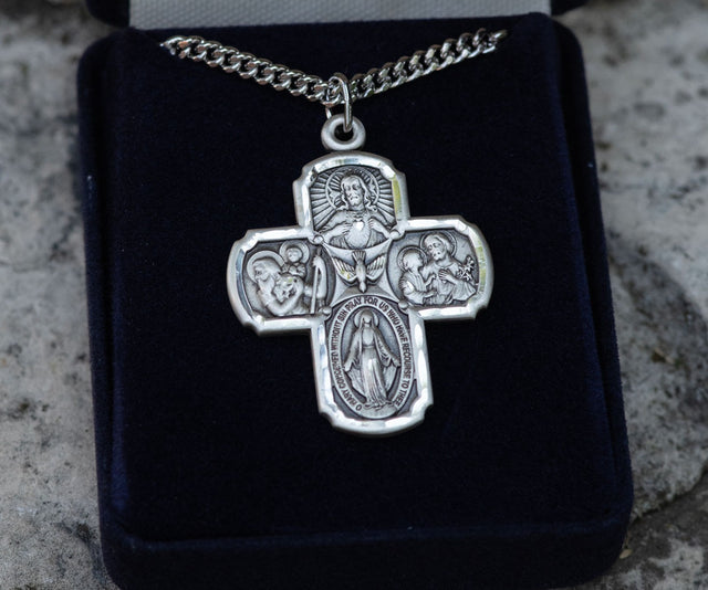 Men’s Large Classic Five-Way Medal – Sterling Silver, Gold-Filled, or 14K Solid Gold | 1 3/4″ - Sterling Silver / 1 3/8" x 1" / 24" Rhodium Plated Heavy Curb Chain with Clasp (2.4mm) is backordered and will ship as soon as it is back in stock.