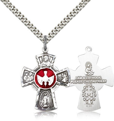 This generously sized 5-way cross pendant is simply gorgeous! It is designed as a classic four-way medal with the added feature of a striking red enamel descending dove.