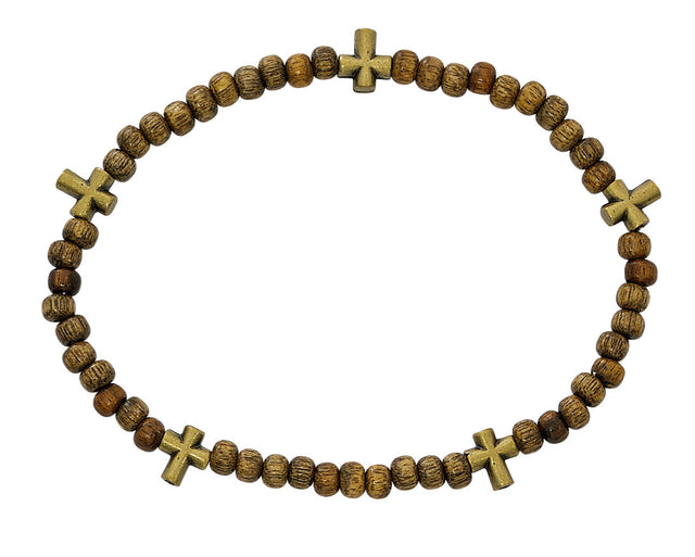 Stretch Rosary Bracelet with Alternating Cross and 5mm Light Brow Wood Beads 8" for Men