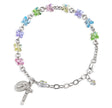 Sure to delight adults and children, this stunning multi-color Austrian crystal butterfly shaped bead rosary bracelet is truly a thoughtful gift. These fine Austrian crystal beads will shimmer and shine on your wrist. Whether you are wearing this bracelet to dress up an outfit or just to feel the comfort of your blessed devotion, it will fully satisfy you with its beauty and grace! A Sterling Silver Miraculous medal and low relief Crucifix charm dangles gently from the bracelet.