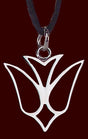 This is a polished Stainless Steel Dove Pendant that features a cut out image of a descending dove. This dove pendant measures 1.5' H and comes with your choice of and 18'L or a 24'L black rat tail cord with a stainless steel clasp.