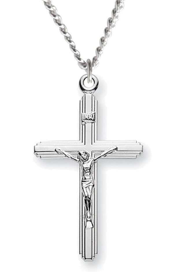 If you are searching for a cross pendant that has contemporary and traditional elements and is just the right size, stop looking as you've found the right one. This crucifix has a cross on cross effect creating as 'stepped' look. The tips of the cross are pointed at the edges. The corpus is slim-line and sits atop the cross with an INRI plaque at the top. Very nice size for both women and teens.
