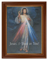 An artwork on canvas featuring the classic image of the Divine Mercy of Jesus with the words 'Jesus, I Trust in You'. This quality canvas is stretched and then placed in the wood frame for a painting look and feel. Choose from two frame options: Antique Gold-leaf Finish or Dark Walnut with Gold Trim. Overall dimension with print and frame is 15.5 inches by 19.5 inches.