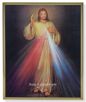 This is a framed print of the classic Divine Mercy of Jesus with the words 'Jesus I trust in you', at the bottom of the print. It comes in a 1/4 inch wide gold frame with crystal clear lamination. This plaque is ready for wall hanging.