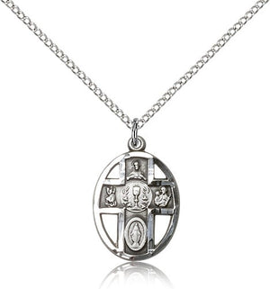 A beautiful oval pendant with an open cut five-way cross contains all sybmols of First Communion with wheat stalks and a chalice. The emphasis on the Holy Eucharist makes this an ideal gift for First Communion.