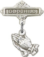 Praying Hands Charm and Godchild Badge Pin - Silver tone / 7/8" x 5/8" is backordered and will ship as soon as it is back in stock.