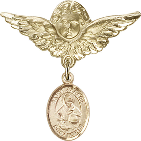 St. Albert the Great Charm and Angel with Larger Wings Badge Pin - 14K Solid Gold / 1 1/8" x 1 1/8" is backordered and will ship as soon as it is back in stock.