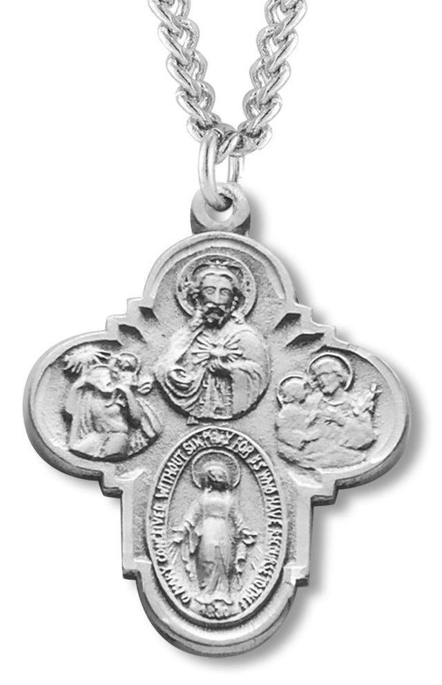 A four-way pendant doesn't get much more classic than this! The cross is designed with a soft matte finish, beautiful hand etched border, and the images of the Sacred Heart, Miraculous, St. Joseph and St. Christopher. Not too big, not too small it will look great on just about anyone. The back of the pendant has images of Our Lady of Lourdes, St. Joseph, the Infant of Prague and the Miraculous symbol.