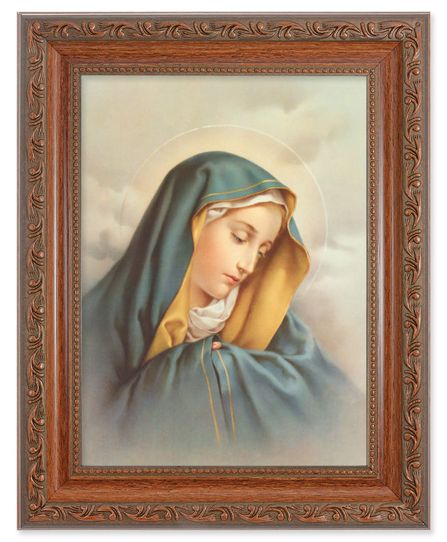 Choose from three frame colors. This 6x8 inch print of the Our Lady of Sorrows is placed under protective glass. The frame measures 8.25 inch x 10.25 inch and is available in a finish of either mahogany, gold-leaf, silver-leaf . Display standing with Velvet Easel Back or wall hang. An ideal gift or personal devotional.