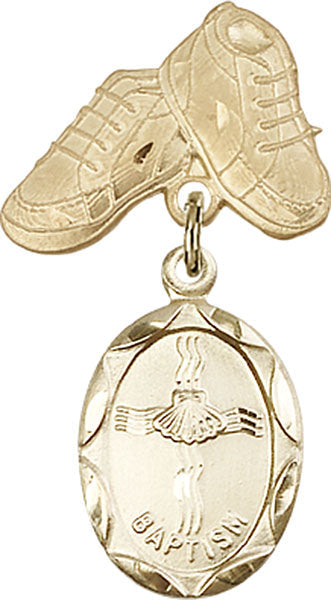 Baptism Charm and Baby Boots Pin - 14K Solid Gold / 1 1/4" x 5/8" is backordered and will ship as soon as it is back in stock.