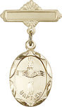 Baptism Charm and Polished Engravable Badge Pin - 14K Solid Gold / 1 1/8" x 5/8" is backordered and will ship as soon as it is back in stock.