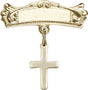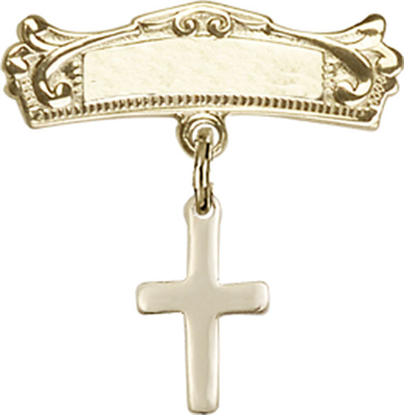 Cross Charm and Arched Polished Engravable Badge Pin - 14K Solid Gold / 7/8" x 3/4" is backordered and will ship as soon as it is back in stock.