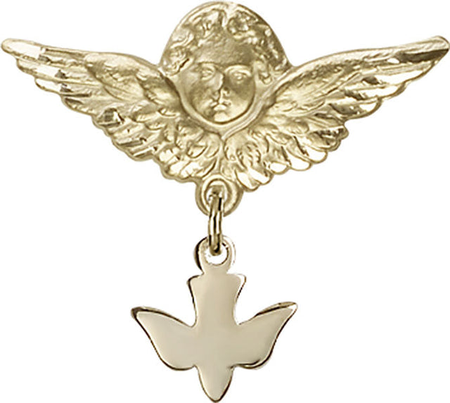 Holy Spirit Charm and Angel with Larger Wings Badge Pin - 14K Solid Gold / 1" x 1 1/8" is backordered and will ship as soon as it is back in stock.