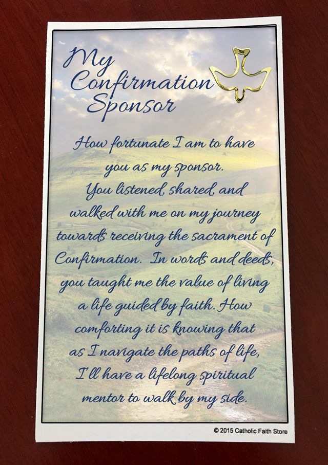 CARD TEXT: My Confirmation Sponsor. How Fortunate I am to have you as my sponsor. You listened, shared and walked with me on my journey towards receiving the sacrament of Confirmation. In words and deeds, you taught me the value of living a life guided by faith. How comforting it is knowing that as I navigate the paths of life, I'll have a lifelong spiritual mentor to walk by my side.