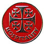 This Hospitality Pin is round in shape and made with gold plate with red enameled color. The pin measures 1' in diameter and is designed with a cross image. The bottom of the pin reads 'Hospitality'. Comes gift boxed.