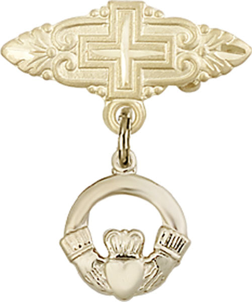 Claddagh Charm and Badge Pin with Cross - 14K Solid Gold / 7/8" x 3/4" is backordered and will ship as soon as it is back in stock.