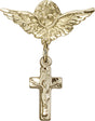Crucifix Charm and Angel with Smaller Wings Badge Pin - 14K Solid Gold / 7/8" x 3/4" is backordered and will ship as soon as it is back in stock.