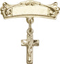 Crucifix Charm and Arched Polished Engravable Badge Pin - 14K Solid Gold / 7/8" x 3/4" is backordered and will ship as soon as it is back in stock.