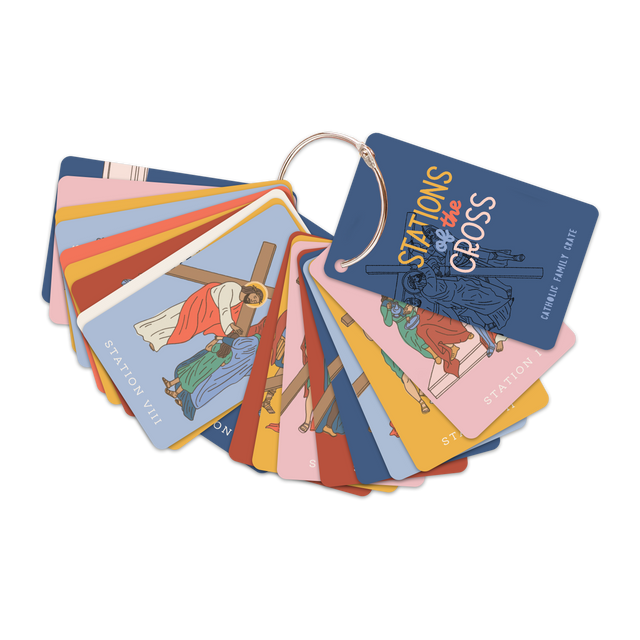 The Stations of the Cross Ring features a series of vibrant illustrations and accessible commentary for each station. The beautifully designed cards capture the essence of the Stations in a compact, easy-to-carry format. Each card includes prayers and reflections tailored to help children (and adults) connect with the journey of Christ's Passion in a meaningful way.