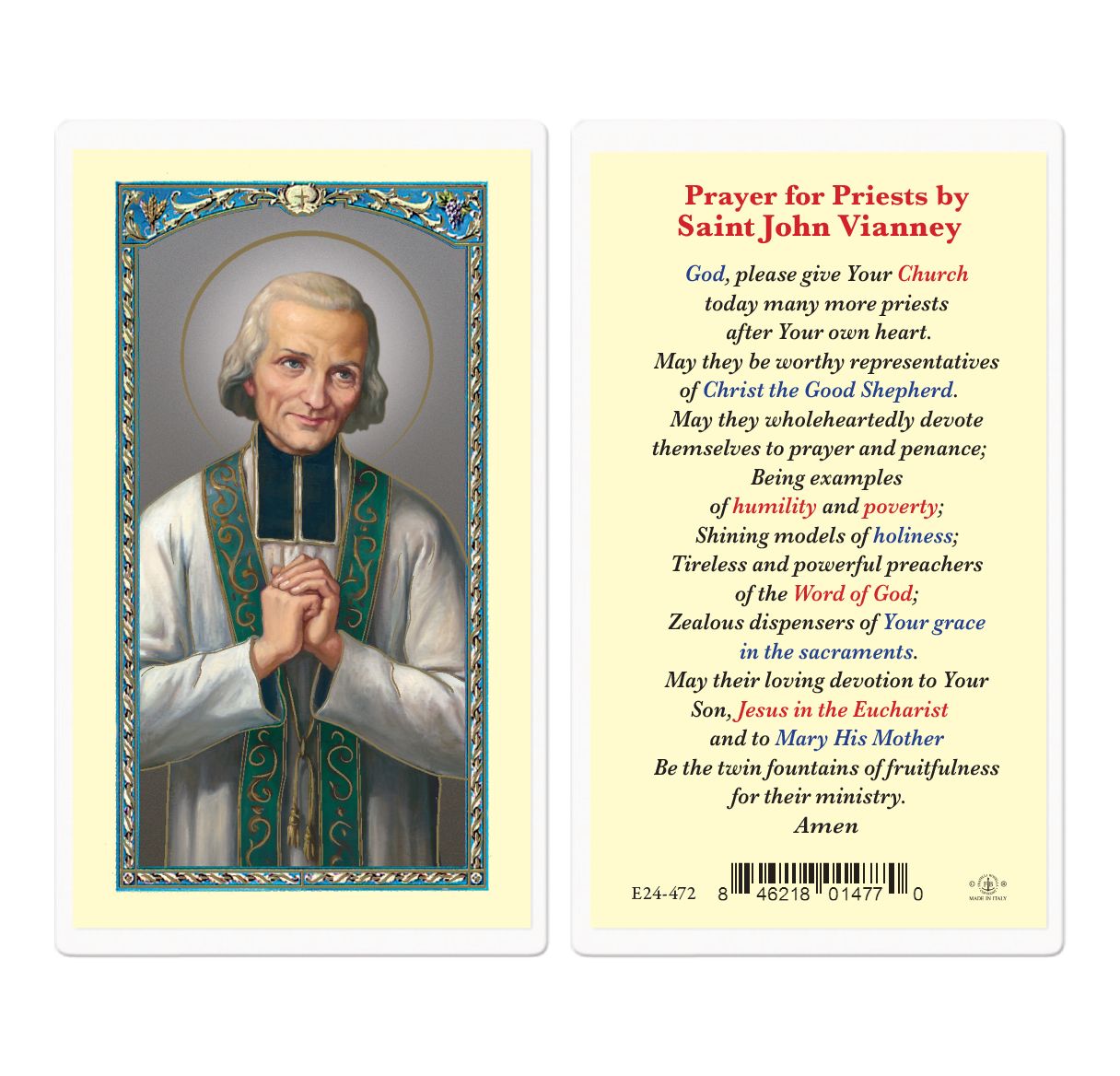 St. John is the patron saint of priests and this card has an image of St. john Vianney on the front and a brief life story on the back.