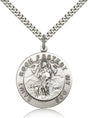 This pendant has a beautiful raised center image of St. Roch. He is flanked by two angels, set in a village scene, and the dog beside him who is said to have licked his wounds until they healed.