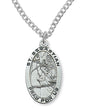 Oval Sterling Silver Saint Sebastian Necklace with traditional design. The border text reads Saint Sebastian Pray For Us. He is the patron saint of athletes.