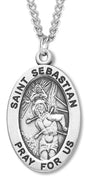 This St. Sebastian pendant is oval in shape and has an image of St. Sebastian being shot with arrows with a beautiful angel over head.The St. Sebastian pendant is available in three sizes and has the following features;