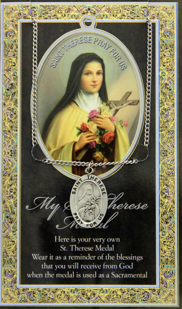 We paired this lovely St. Therese medal with an elegant prayer card to make for a special gift. The St. Therese medal is an oval shape with the words Saint Therese Pray for Us on the front and a plain back. A dainty 18 inch stainless steel chain with clasp is included.