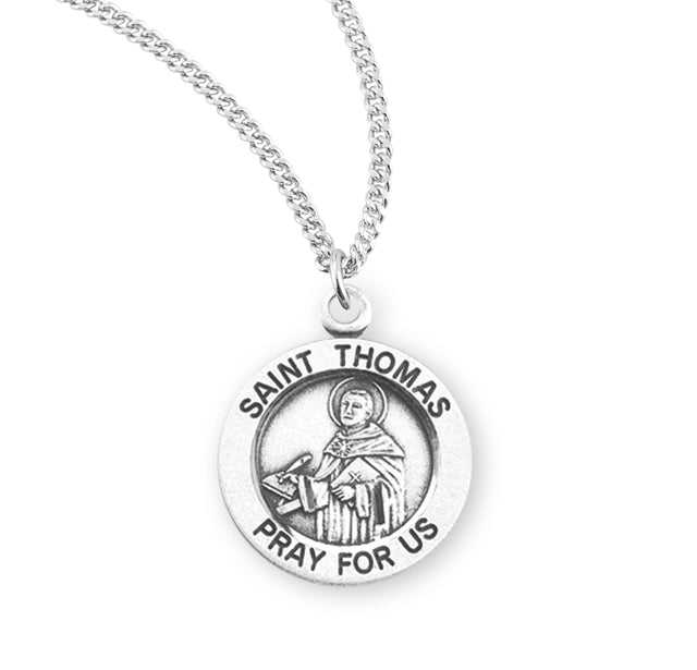 This pendant is round-shape and the center image is one of Saint Thomas writing in a scholarly pose with quil pen and book at his side. The border text reads SAINT THOMAS AQUINAS PRAY FOR US.