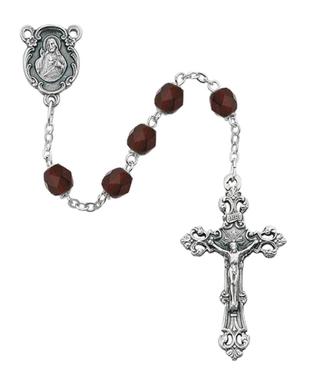 With an open cut filigree crucifix, this January Birthstone Rosary is paired with fire polished round faceted Aurora Bohemian glass 6mm beads. The Sacred Heart centerpiece and Crucifix are both made of Oxidized Silver. This rosary is presented in a deluxe gift box.