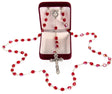 A deep red Aurora glass bead makes for a stunning July Birthstone Rosary. The rosary is paired with a Sacred Heart centerpiece and an elegant Crucifix features with decorative edges.