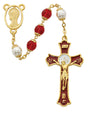 Elegant and symbolic this rosary has a gold tone finish with red enameled crucifix. The prayer beads are double capped, cream for the Our Father beads and red pearlized for the Hail Mary beads. Crucifix includes a Chalice, wheat, and grapes accent. Centerpiece is an open-cut Madonna profile.
