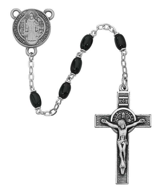 The double-sided St. Benedict centerpiece is round in shape and paired with classic oval black glass beads. The textured crucifix also contains the St. Benedict medallion.