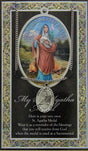 The prayer card pamphlet measures approximately 3 1/4 inch x 5 1/2 inch. The pendant is made of pewter and comes with an 18 inch long stainless steel chain. Pendant size is 1 1/8 inch high. Made in Italy.