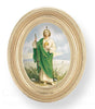 Designed in Italy, this 4.5-inch-high oval shaped frame features a gold-stamped print reproduction of the image of Saint Jude and is available in your choice of either a silver-leaf or gold-leaf frame. The print is under protective glass and the frame includes an easel for easy standing. The smaller size makes for an ideal favor at your special event, a personal devotional, or a gift. Will look beautiful wherever it is placed. Quality craftsmanship and artwork.