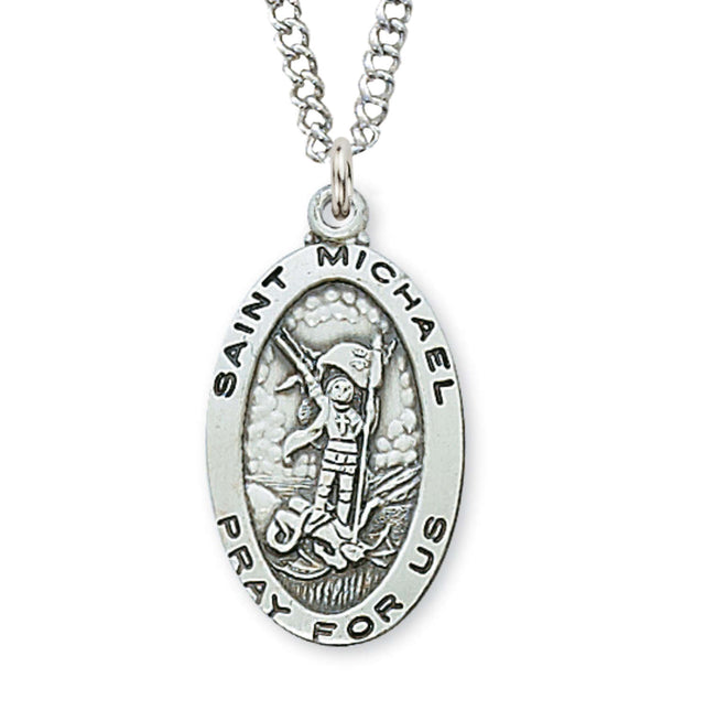 Oval classic shaped Saint Michael Necklace with the words Saint Michael Pray Us. He is the patron saint of Police Officers, EMTs and Soldiers.