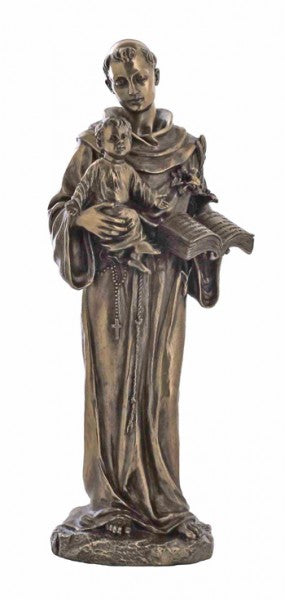 This magnificent St. Anthony statue has been created from cold-cast bronzed resin. He has been crafted with much attention to detail and the color contrasts are amazing! He gently holds the Christ child in one hand and the Bible in the other. This glorious statue would make a great addition to your indoor or outdoor decor.