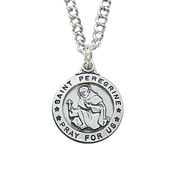 A smaller Saint Peregrine Medal for a youth or woman to wear. Traditional round shape with an image of the saint in the center and on the border the words Saint Peregrine Pray Us. He is the patron saint of those with cancer.