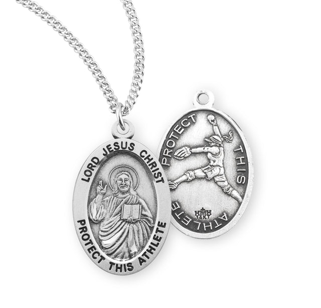 What a great way to keep Christ near! This oval shaped sterling silver Softball pendant has an image of Christ on the front and an image of a Softball player on the back. Text includes: Lord Jesus Christ Protect This Athlete.
