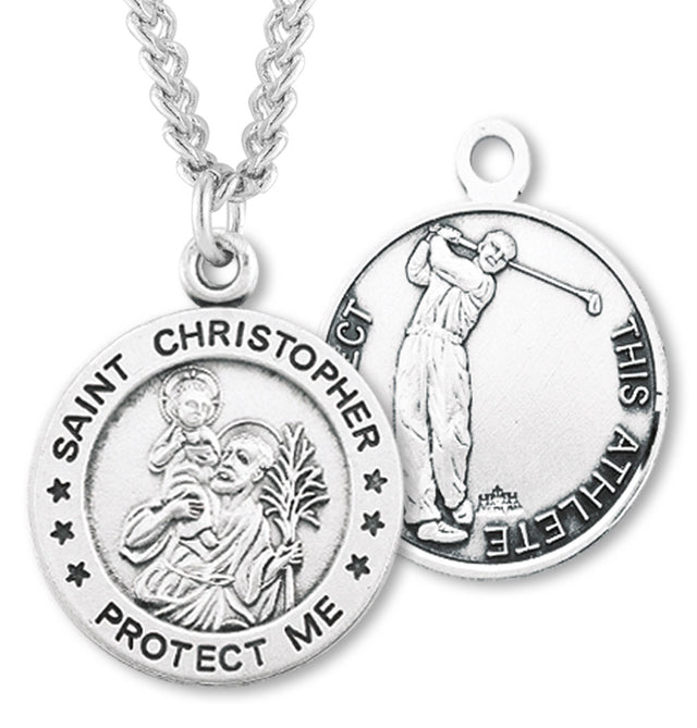 This St. Christopher pendant is round shaped and shows an image of St. Christopher carrying the Baby Jesus on his shoulder. This pendant would be the perfect gift for any golf playing athlete. This St. Christopher medal has the following features;