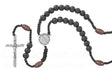 This popular rosary is ideal for the athlete who loves Football and faith! The rosary is made with a corded link for a sturdy construction. The Our Father beads are in the shape of a football and the Hail Mary beads are 9mm black wood beads. There is a silver tone Saint Sebastian round medallion centerpiece and a large angle-edge slimline crucifix.