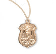 Perfectly sized for a teenager or petite woman to wear! The textured background depicts St. Michael defeating the devil. On each side of the badge are the words Saint Michael Protect Us. Shield shape corresponds to an officers badge.