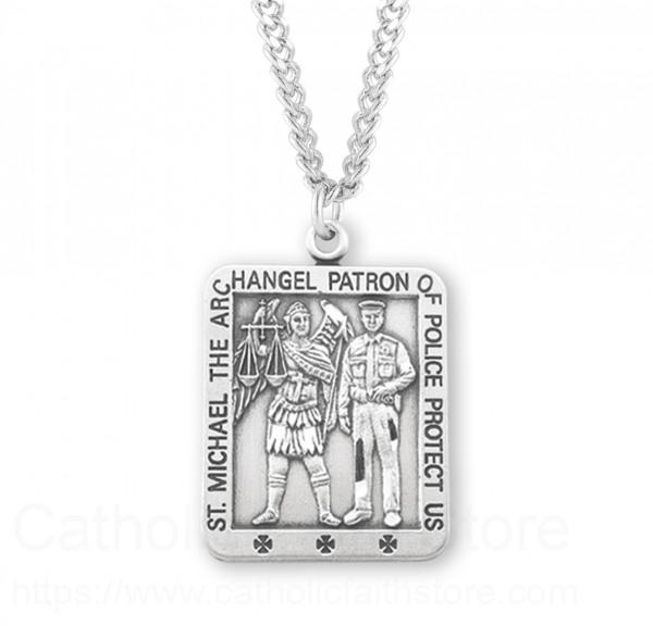 Saint Michael and a Police Officer stand shoulder to shoulder in the center image of this medal. A perfect gift for the police officer in your life as it reaffirms your desire for his / her safety at work. The border reads St. Michael the Archangel Patron Saint of Police Protect Us.