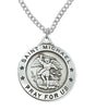 This Men's Saint Michael necklace has a wide border and round in shape. In the center is an image of St. Michael with a sword in one had, scales of justice in the other. He stands victoriously on the devil symbolized by the dragon. The top text reads Saint Michael, two stars separate the bottom text on either side, bottom text reads Pray For Us.