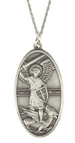 This Saint Michael pendant is oval in shape and measures 1 1/2' tall. The pendant is made of base metal with an antique silver finish and comes with an 18' rhodium chain. Gift Boxed.