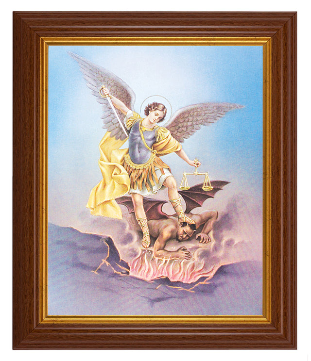 With a look and feel of textured canvas, this 8x10 inch artwork print is mounted onto artboard and then framed. The image features Saint Michael defeating the devil and protecting the heavens. Framed in a Classic Dark Walnut Finish. Overall dimension with print and frame is 10.5 inches by 12.5 inches.