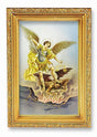 This is a beautiful framed print of St. Michael. It comes in an antique-style gold frame under glass. This print has an easel back or wall hanging option. This framed print comes gift boxed.
