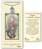 The prayer card itself depicts St. Michael on the front and a prayer to him on the back. The prayer card measures approximately 3' x 4.5'.