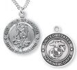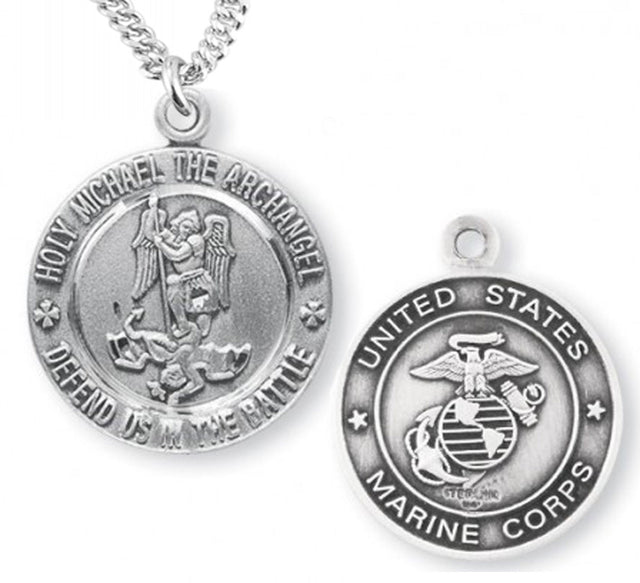 This is a sterling silver St. Michael Marine medal with insignia. On the back is an image of St. Michael and the words, 'Holy Michael The Archangel Defend Us In The Battle.'